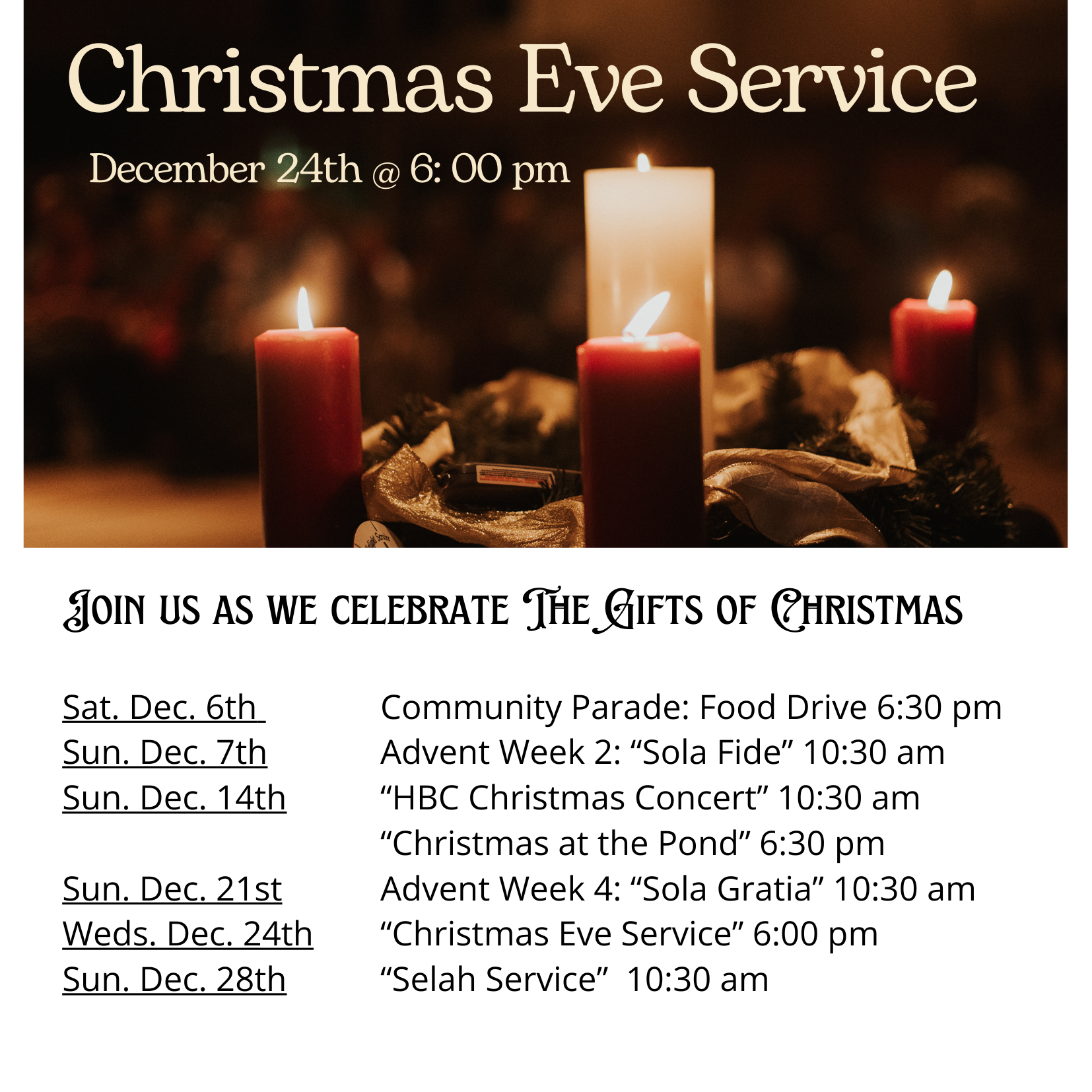 You won't want to miss our annual Candlelit Service this Christmas Eve! It is a beautiful time to gather as a church family and reflect on the Savior's birth.
